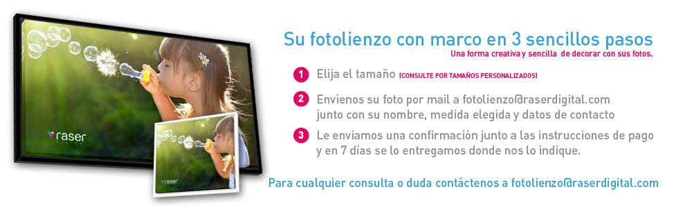 El Fotolienzo con marco es un lienzo impreso con su foto en calidad fotográfica montado en un bastidor de 3,5 cms con un marco de madera lacado en color.